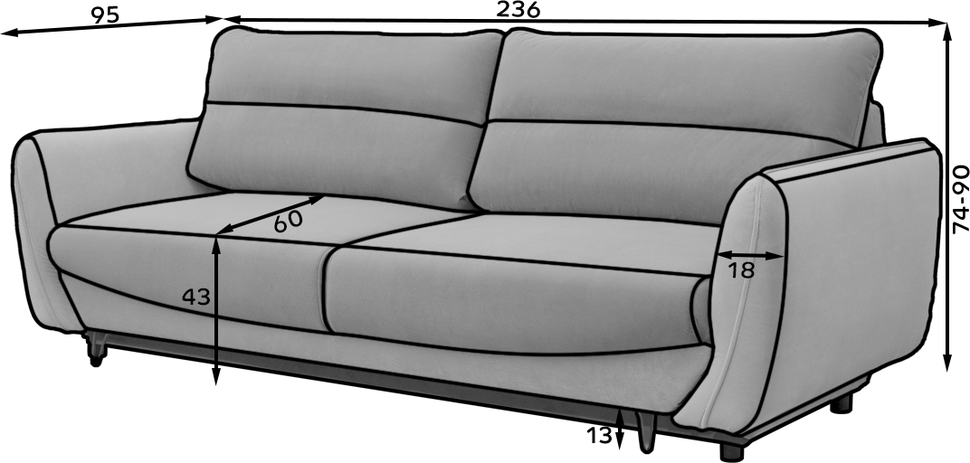 Die Polsterung aus Schaum im Sitzbereich sorgt für optimalen Komfort und Formstabilität. Die Rückenlehne besteht aus Schaum und wird durch zwei lose Rückenkissen ergänzt, die ergonomischen Halt bieten. Mit seinen kompakten Maßen von 236 x 95 x 90 cm ist das Sofa Sonic eine hervorragende Lösung für minimalistische und funktionale Wohnräume.